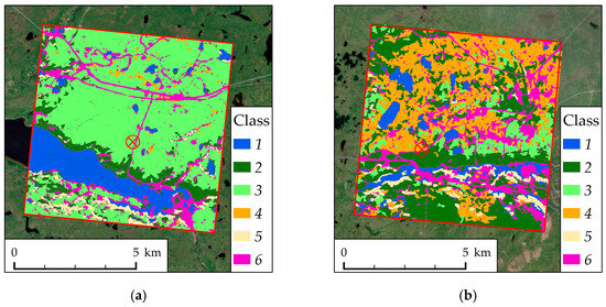 Preliminary overview classifications of the study areas were performed using satellite data of medium spatial resolution (15–100 m) Landsat–8 OLI/TIRS (Operational Land Imager/Thermal Infrared Sensor), which are freely available in The United States Geological Survey (USGS) catalogs (https://earthexplorer.usgs.gov, accessed on 25 August 2025) [38]. To obtain an expert opinion on the state of the landscapes, we analyzed images in combination of Landsat-8/OLI channels B4-B3-B2 (natural colors) and B6-B5-B4 channels. Landsat-8 OLI/TIRS channels have the following wavelength (in µm): 0.43–0.45 for B1 (Aerosol); 0.45–0.51 for B2 (Blue); 0.53–0.59 for B3 (Green); 0.64–0.67 for B4 (Red); 0.85–0.88 for B5 (Near-Infrared); 1.57–1.65 for B6 (SWIR1, Short-Wavelength Infrared); 2.11–2.29 for B7 (SWIR2, Short-Wavelength Infrared); and 10.6–11.19 for B10 (TIR1, Long-Wavelength Infrared). Spatial resolution is equal to 100 m for the B10 channel and 30 m for the other channels.