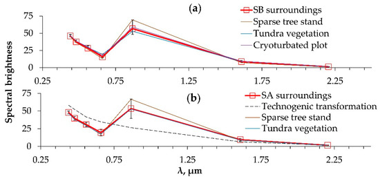 The vegetation states in the background territory of the SB test site that have been identified are distinguished by spectral curves that are similar. The differences between spectral curves are within the range of two standard deviations across the entire spectrum (Figure 5a). The class of “technogenic transformation” is used to classify the aerotechnogenic impact on vegetation in the landscape of the SA site (Figure 5b). The spectral curves of the SB and SA neighborhoods do not reveal any substantial differences; however, the degree of mosaicity of the landscapes and the distribution of classes do. The SA landscape is characterized by a high degree of mosaicism, which includes industrial-affected transformations. The background SB site is largely homogeneous (Figure 4).
