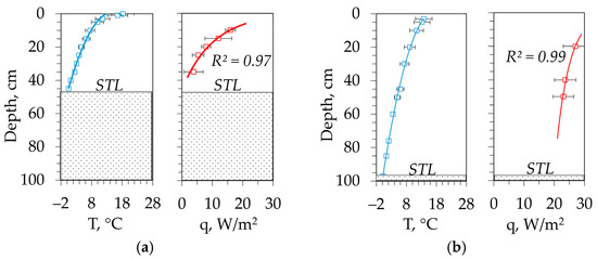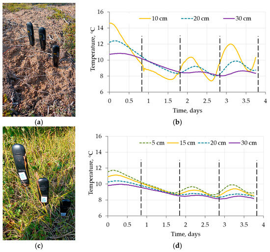 The moisture content was determined using a weight method for each of the identified soil layers. Soil temperature measurements were conducted along the soil profile using contact method. With a step of 5–10 cm, the set of temperature sensors were inserted into the soil pit wall (Figure 3a). The temperature measurements were collected at depths as low as the permafrost boundary. Another set of temperature measurements was conducted for an extended period (36 days) at four distinct depths (ranging from 0 to 30 cm) with a temporal interval of 10 min. The EClerk data logger’s sensors were vertically inserted into the soil at varying depths. The 10 min interval between temperature measurements was less than the characteristic time of the temperature field change at the depths of sensor installation (5 cm and more) and provided the necessary detail of the time series, which was subsequently used to estimate thermal diffusivity coefficients for soil layers.