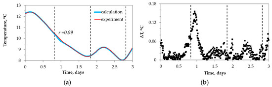 If the daily temperature oscillations are nearly harmonic, Equations (3) and (4) are employed to determine thermal diffusivity by measuring temperature at various depths. Deviations from harmonic dependencies, such as second harmonics, are considered by proposed enhanced methods [28,46]. However, these methods are ineffective in situations where harmonic dependencies are exceedingly deviant. The values of thermal diffusivity that are determined by (3) and (4) may differ by several dozen percent.