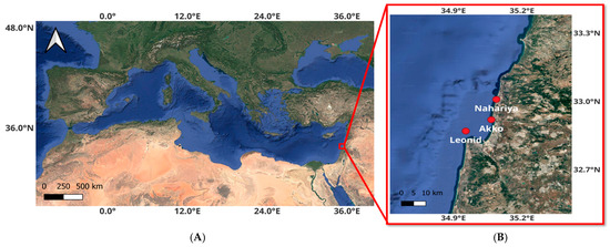 Location of sampling locations along Israel’s Mediterranean coast (A). Inset (B) shows, from north to south, Naharia, Akko port excavation site of well-preserved sub-fossil Cladocora, and the southern Haifa Bay Leonid shipwreck.