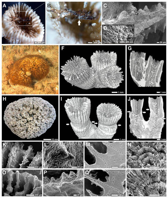 Exceptionally preserved specimens of sub-fossil Cladocora display (A,B) dark-brown structures attached to the skeleton and stretched between septa (arrow in B), interpreted as remnants of polyp tissue (examined for aDNA), and (C,D) the nanogranular structure of RADs, which is typically lost even in slightly diagenetically altered skeletons. Direct morphological comparisons between Recent (C,E–G,K–N) and sub-fossil Cladocora (H–J,O–R). The overall colony shape of living (E) and sub-fossil Cladocora (H) is shown. Microtomographic reconstructions of modern (F) and sub-fossil (I) corallites are shown along with their virtual sections (G,J, respectively). SEM micrographs show the distal view of calices and the septal faces in both modern (K,L) and sub-fossil (O,P) specimens as well as etched transverse sections of septa and wall of modern (M,N) and sub-fossil (Q,R) specimens. Arrows in (I,J) mark rejuvenescence constrictions of the calices.
