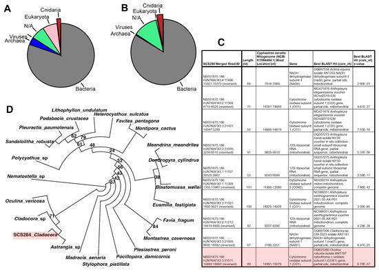 aDNA. Scleractinians represent 0.3% and 0.06% of non-redundant (A) and total (B) assigned BLAST hits to all merged reads from the sub-fossil Cladocora sp. extraction with the highest number of alignments to three faviid mitogenomes (sample SCS284) and that were over 100 nucleotides in length were BLASTed against the NCBI core nucleotide database with an expect score threshold of e−20; phylum Cnidaria is highlighted within super-kingdom Eukaryota. Ten of 90 merged reads from SCS284 mapped to the Cyphastrea serialia mitogenome and had best BLAST hits to cnidarian genes in the NCBI core_nt database (C). One merged SCS284 read mapped and BLASTed to the cnidarian CO1 gene, highlighted light red in (C); this read—also highlighted in red—clusters with DNA from modern Cladocora sp., Oculina vericosa, and Astrangia sp. (D).