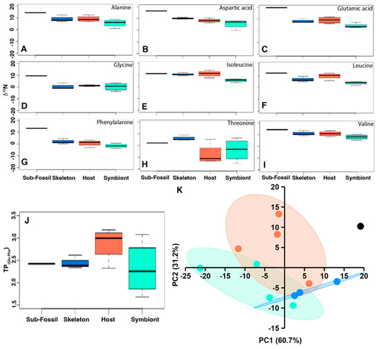 Similarly to carbon CSIA-AA analysis, the nitrogen CSIA-AA shows no significant difference between the host, symbiont, and skeleton of the contemporary Cladocora (PERMANOVA monte-carlo p = 0.66, Figure 5). However, the sub-fossil coral skeleton δ15N values of individual amino acids are higher than the contemporary ones by an average of 2–13‰ (Figure 5A–I) except for threonine and isoleucine, which fall within their range. Interestingly, the highest difference (>13‰) is observed in source AA phenylalanine (Figure 5G) which is not affected by trophic discrimination in the food web. There is also no significant difference in the trophic position (TPGlu-Phe) between the host, endosymbionts, and skeleton of the contemporary coral, and the sub-fossil coral TPGlu-Phe skeleton is similar to the contemporary one (Figure 5K).