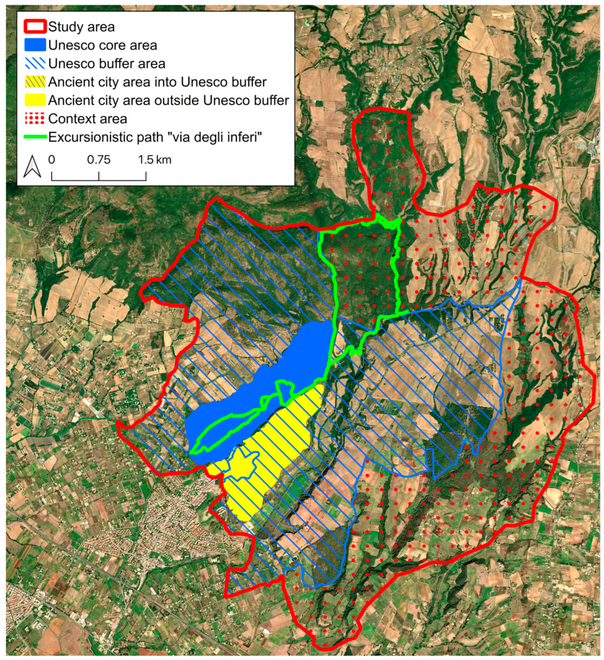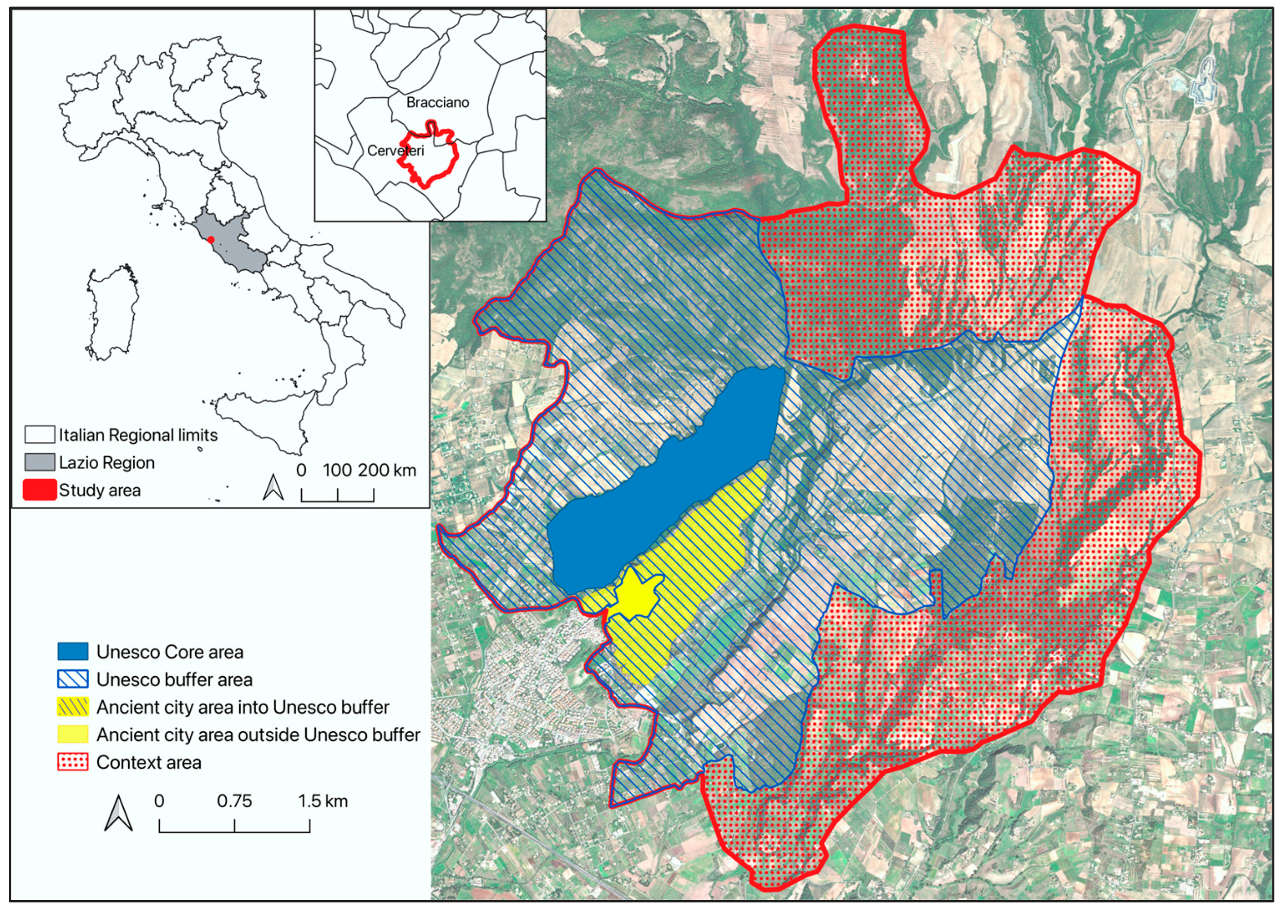 - The second area is the “UNESCO buffer area” (1814 ha) in knurled blue, which includes almost the total ancient Etruscan city named Caere (in yellow in the map). The site is a relevant testimony of the Etruscan civilization, which lasted in Etruria (Central–Northern Italy) from the Iron Age (11th century BC) to the 1st century BC, when the Roman civilization prevailed over the Etruscan one [37,38].