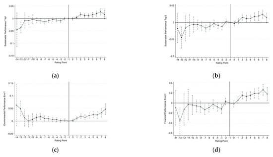 In order to determine whether corporate sustainable performance shows varied changes prior to and following the adoption of the ESG rating policy, we first employ event study methodology and conduct a multi-period DID test. The results show no discernible difference in sustainability performance indicators (Tdp1, Tdp2) between the pre-policy control group and the post-policy treatment group after tracking from the pre-policy period to 14 post-policy periods and 8 post-policy periods (as indicated above) (see Figure 2). However, the post-policy treatment group outperformed the control group in performance indicators following the implementation of the ESG rating policy, suggesting that the policy plays a significant role in enhancing corporate performance.
