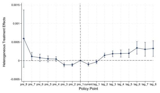 Researchers have noted that the multi-period DID model implicitly assumes homogeneous treatment effects by calculating a weighted average of effects across groups at various times. Whether the context is static or dynamic, estimating with the traditional two-way fixed-effects model frequently introduces potential bias. In order to confirm whether the multi-period DID two-way fixed-effects estimates are still significant under heterogeneous treatment effects [41], this study uses the analysis method of De Chaisemartin and D’Haultfoeuille (2020) [42], dissecting all weights (see Figure 3). The reliability of the results was confirmed by the analysis, which showed that 5191 of the 5234 2 × 2 DID pairs had positive weights and only 43 had negative weights (less than 5%). A better-corrected average treatment effect (β = 0.0001295, p < 0.01) was obtained by estimating the weighted average effects of the “good” control groups after the “bad” control groups were eliminated.
