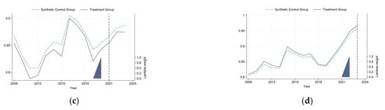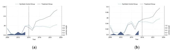 Important empirical patterns are revealed by the visualization analysis (see Figure 4). The treatment and synthetic control groups had comparable paths before the policy intervention. However, ESG performance measures showed clear structural breaks after the policy shock as the treatment group’s ESG ratings fell sharply compared with the synthetic control group. These results imply that corporate dual organizational performance and its sub-dimensions are positively impacted by ESG rating policies, which is in line with the benchmark regression results. ESG rating policies result in significant improvements in the composite dimensions of corporate dual organizational performance through mechanisms like resource reallocation and the transmission of institutional pressure. Despite possible model misspecification, this conclusion is still strong.