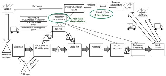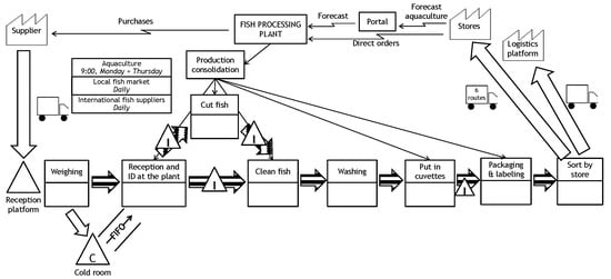 The operations of fresh fish reception, processing, and packaging are ensured by the retailer’s personnel; however, all the activities taking place downstream, namely the separation of the processes product already packed according to the store to be sent for, palletization of the packages, and place these pallets in the containers attached to the lorries that will distribute the products to the stores.
