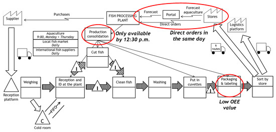 This stage focused on studying and understanding the root causes which prevented the planned daily production from being completed by 9:30 p.m. These causes are related to a set of wastes, such as excess of inventory, and were identified with the help of the previously drawn VSM, as depicted in Figure 3 by the red circles, and may be described as follows: