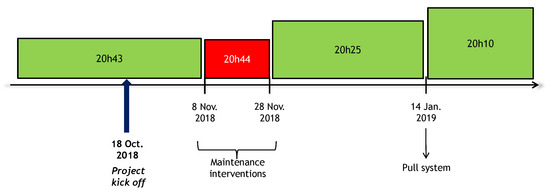 The distribution of the 40 h per week over the different working days of the week was rethought, to adapt it to the expected production volume. Instead of considering an equal distribution of 8 h for all the working days, it was allocated a greater number of working hours on the days when a greater workload was expected (i.e., to match the number of working hours to the production volume’s historical data). The result of this weekly work reschedule is summarized in Table 5.