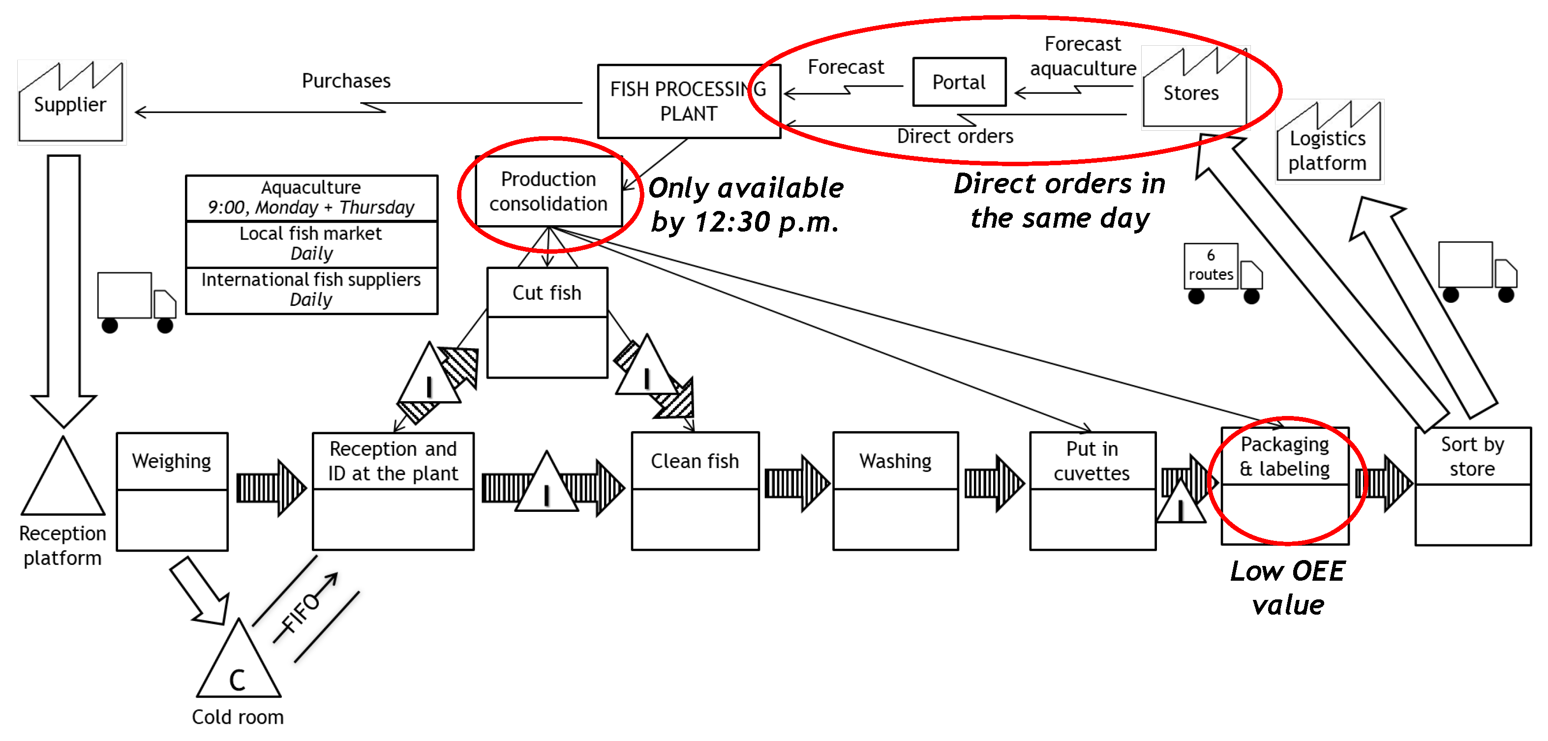 - Timely consolidation of the production plan, as stores would start placing direct orders two days in advance. This demand-pull system would then eliminate the need to maintain a buffer of WIP inventory around the fish cutting and cleaning operations, hence promoting a continuous flow throughout the entire fish processing value stream, which also means that packaging and labeling can start around 3 h earlier. This reduction in the lead time due to the implementation of a demand-pull system is corroborated by the literature, as it helps to stabilize and reduce the WIP and enhances operational performance by building customer response capability. These efforts helped to minimize work-in-progress accumulation and associated material and time waste, this leads to leaner, more sustainable production practices.