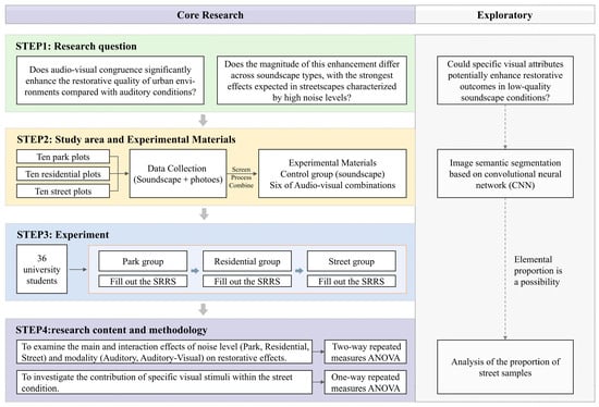 To address these gaps, the present study systematically examines the effects of audio-visual congruence in large-scale urban environments. Specifically, we focus on three representative types of urban green space (park, residential, and street) and compare restorative outcomes under auditory and audiovisual conditions. This approach allows us to assess whether audiovisual integration consistently enhances restoration across different noise levels and whether its compensatory effects are particularly pronounced in noise-dominated environments. Based on this objective, we formulate the following research questions (Figure 1):