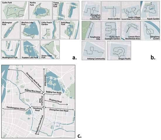 Environmental sounds were collected using the soundwalk method along predefined survey routes. A soundwalk is a structured method for collecting and experiencing soundscapes in situ, in which researchers or participants follow a predetermined route at a constant pace while systematically listening to, recording, and documenting the surrounding acoustic environment. This approach captures the temporal and spatial variation of soundscapes and has been widely recommended in international soundscape standards [,]. For parks, the routes followed main pathways. In residential areas, pedestrian-prioritized roads or roads with landscaping were selected. For streetscapes, linear, one-way recordings of environmental sounds were made along the survey routes. Specific survey routes are shown in Figure 2.