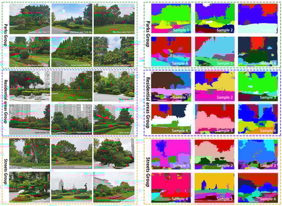 Semantic segmentation analysis, based on convolutional neural networks (CNN), was used to quantify landscape elements in the images []. This method classified each pixel into corresponding landscape categories, providing objective quantification of visual characteristics (Figure 3). Semantic segmentation analysis quantified the proportion of key visual elements (sky, tree canopy, grass, road surface, building façade, wall) for each image. On average, park samples were dominated by vegetation, with 47.53% tree canopy, 13.24% grass, and 15.33% sky. Residential samples had minimal sky (0.03%) and grass (0.22%) but exhibited the highest building proportion (18.62%) and 3.40% walls, indicating a more enclosed setting. Street samples displayed 56.27% tree canopy and 8.02% sky, but almost no grass (0.22%), reflecting tree-lined streets with limited ground-level greenery.