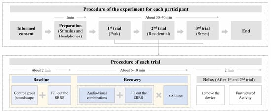 Before the experiment, participants underwent a 3-min calming period to prepare. Instructions about the study objectives, SRRS, and rating procedures were provided. Participants listened to soundscapes through headphones and completed SRRS ratings. They then viewed six photos paired with the corresponding soundscape and rated each audio-visual combination. Photos were presented sequentially on computer and tablet screens to facilitate detailed observation. Soundscapes were continuously played during the evaluation to ensure consistency. All trials lasted 30–40 min per participant (Figure 4). Equipment included Huawei AM115 headphones (Huawei Technologies Co., Ltd., Shenzhen, China), Huawei M5 tablets (Huawei Technologies Co., Ltd., Shenzhen, China), and Dell G15 laptops (Dell Inc., Round Rock, TX, USA).