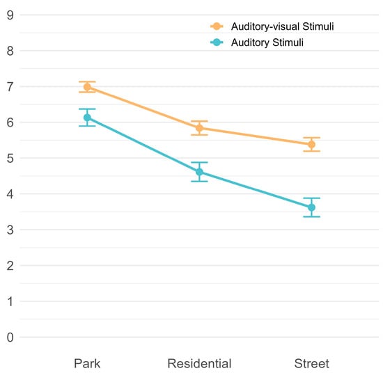 A two-way repeated measures ANOVA was conducted to examine how noise levels and modality affected restorative effects. Mauchly’s test of sphericity showed that the assumption of sphericity was met for both the main effect of noise level (W = 0.914, χ2(2) = 2.69, p = 0.261) and the interaction between noise level and modality (W = 0.910, χ2(2) = 2.82, p = 0.244). This allowed for unadjusted degrees of freedom in the repeated measures ANOVA. Figure 5 illustrates the mean restorative effect scores (±95% confidence intervals) for each noise level (Park, Residential, Street) and modality (Auditory vs. Auditory-Visual).