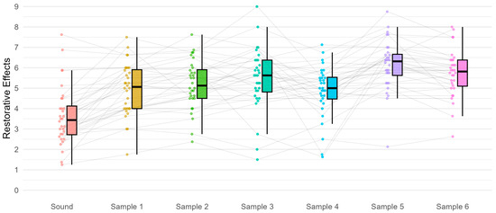 Post hoc pairwise comparisons using the Holm correction showed that all 6 samples in street condition demonstrated significant restorative effects, as evident by significantly higher scores compared to the sound condition (p < 0.001). Meanwhile, Sample 5 exhibited the strongest restorative potential. For detailed pairwise comparisons and descriptive statistics, refer to Figure 6 and Table 2.