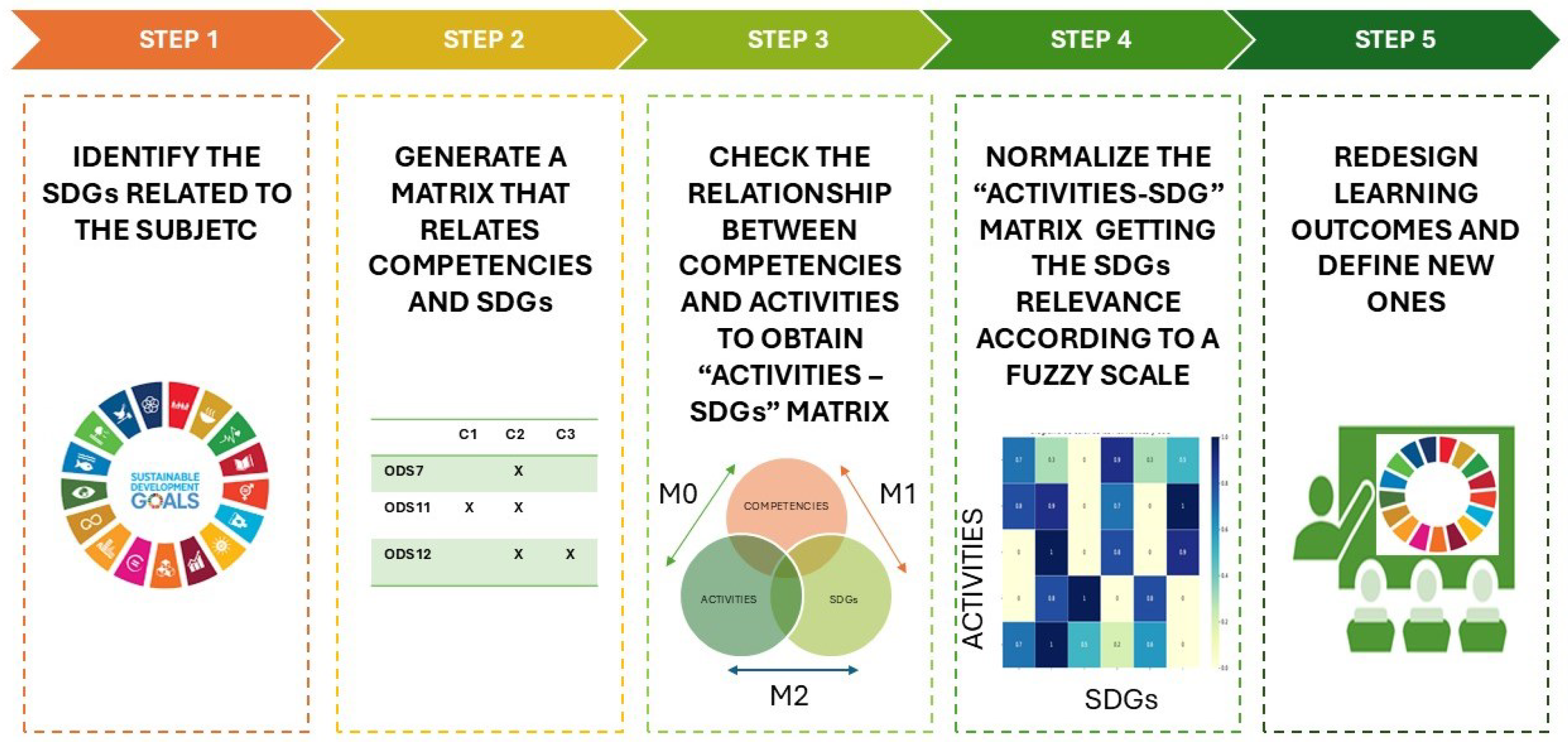 - Competencies–SDGs correspondence. The next step consists of establishing the relationship between subject competencies and SDGs. This is represented by a correspondence matrix: