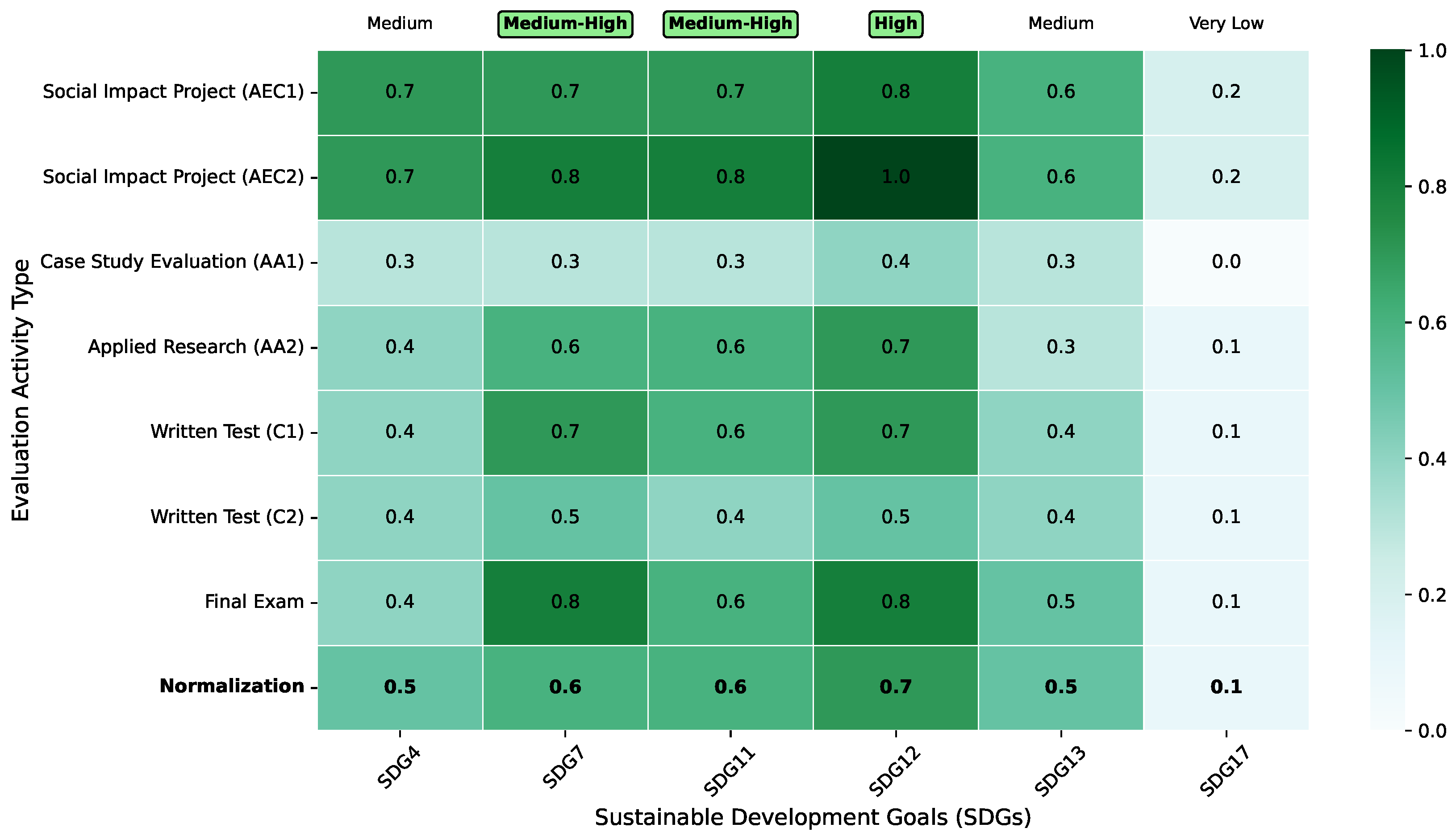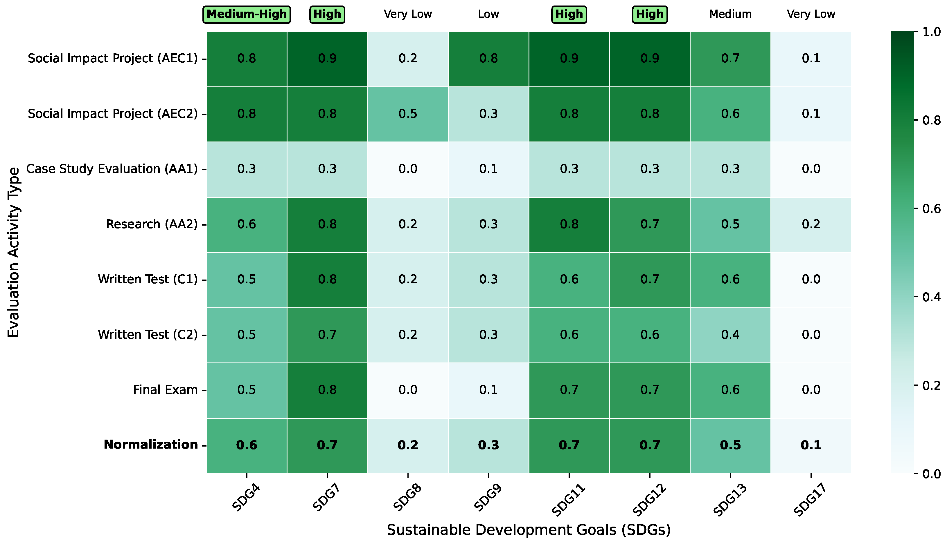 - Normalization and fuzzy scale. To make the results comparable, raw frequencies are normalized:The normalized values are then mapped to a fuzzy linguistic scale that captures the degree of alignment between each activity and the SDGs [34]:The result of this step is the normalized activities–SDGs matrix, which provides a systematic and visual evaluation of the alignment of each activity with the selected goals.