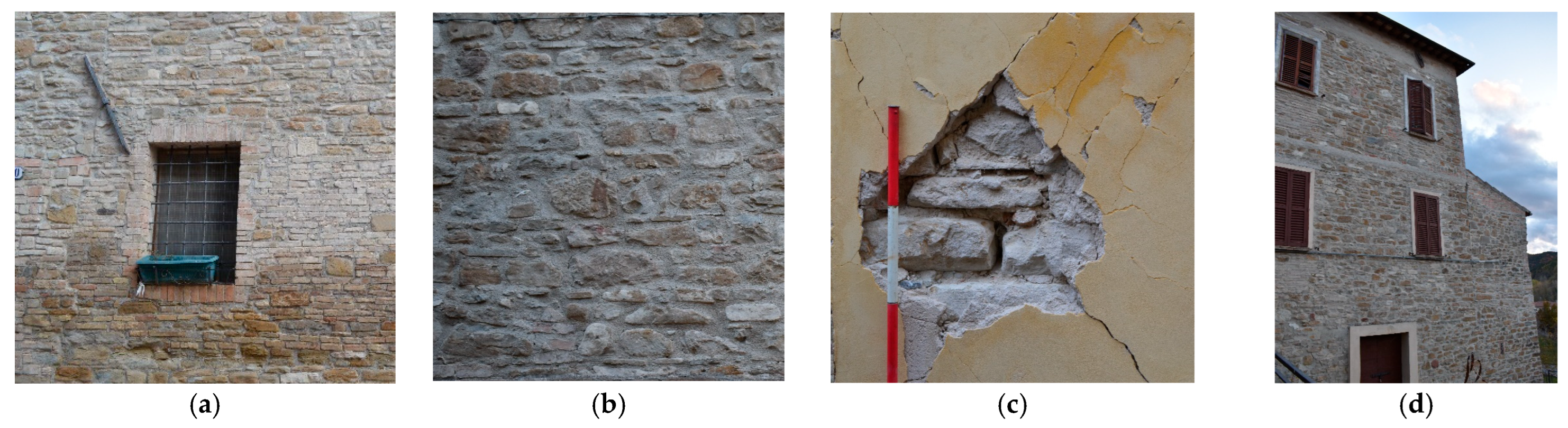 - Sbrogiò, L.; Saretta, Y.; Valluzzi, M.R. Empirical performance levels of strengthened masonry buildings struck by the 2016 Central Italy earthquake: Proposal of a new taxonomy. Int. J. Archit. Herit. 2022, 17, 1017–1042. [Google Scholar] [CrossRef]