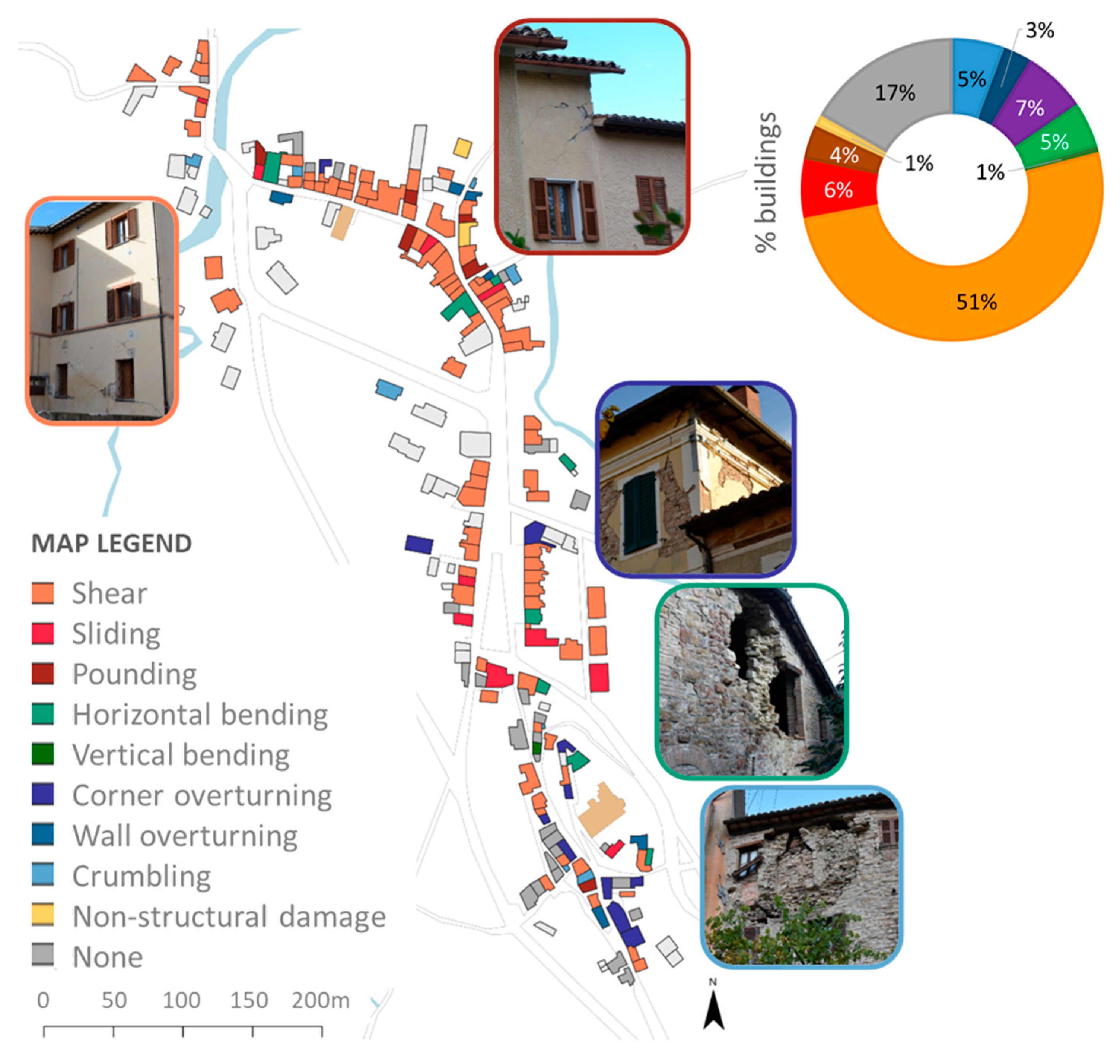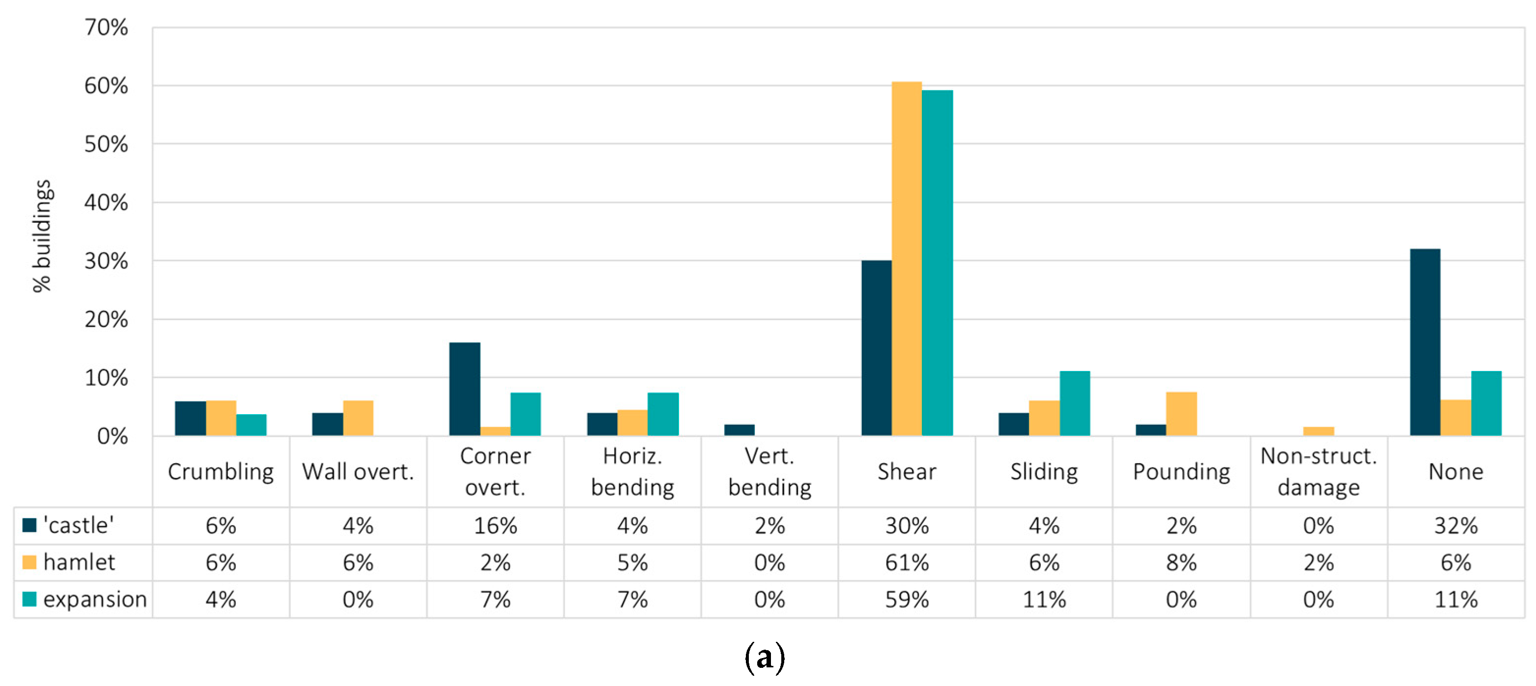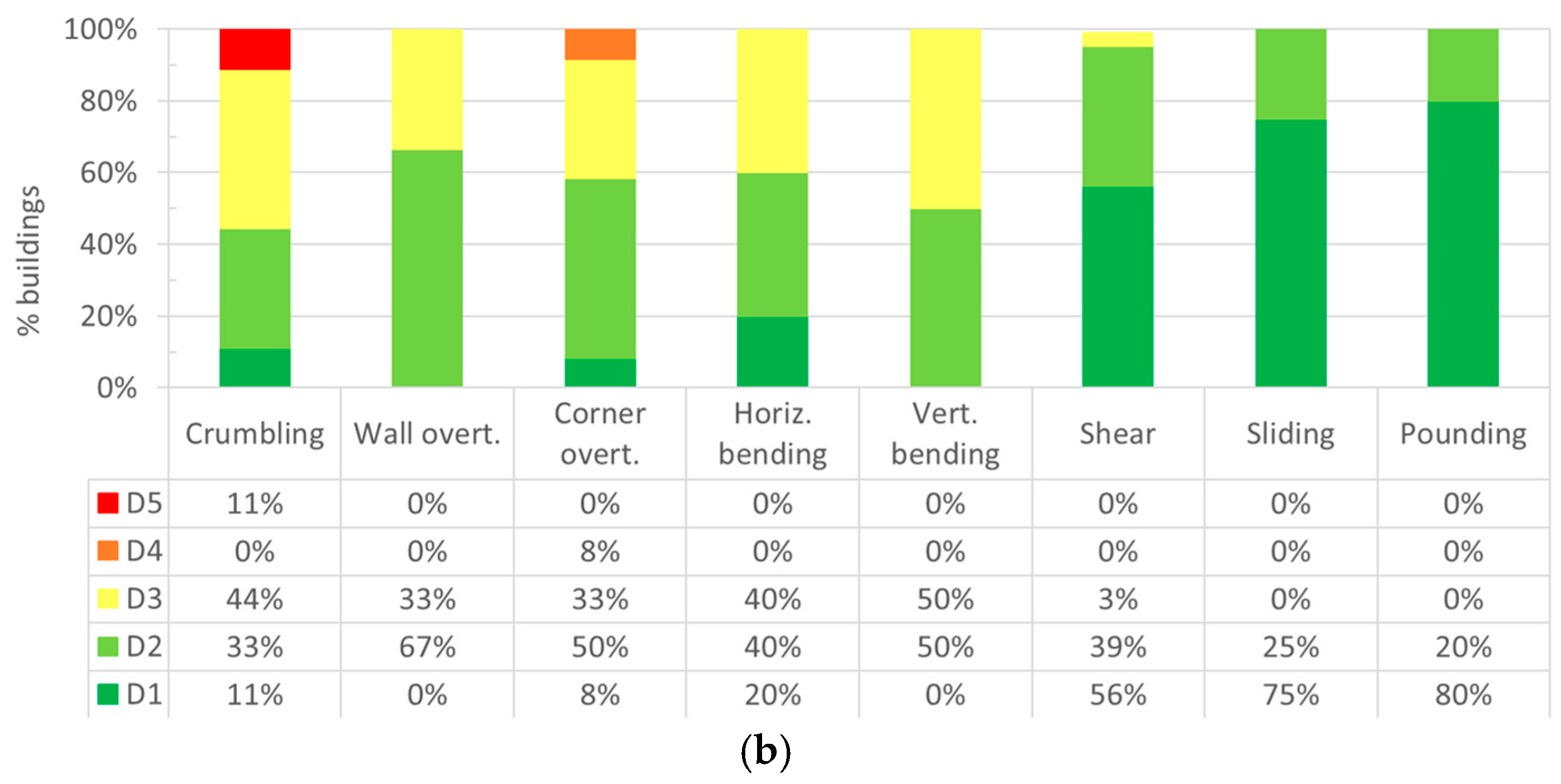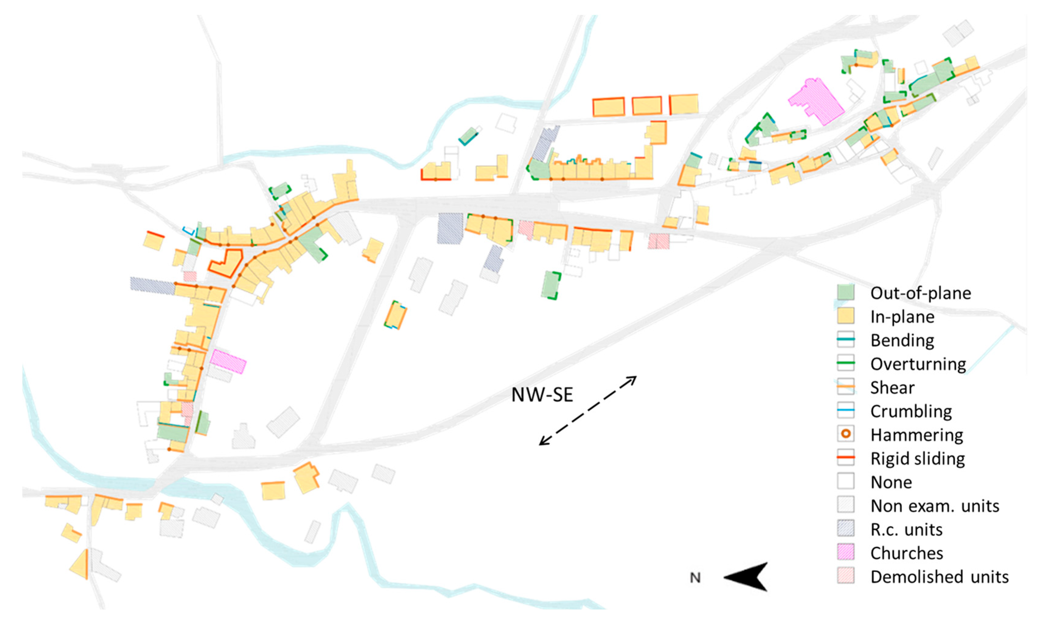 - Sisti, R.; Di Ludovico, M.; Borri, A.; Prota, A. Damage assessment and the effectiveness of prevention: The response of ordinary unreinforced masonry buildings in Norcia during the Central Italy 2016–2017 seismic sequence. Bull Earthq. Eng 2019, 17, 5609–5629. [Google Scholar] [CrossRef]