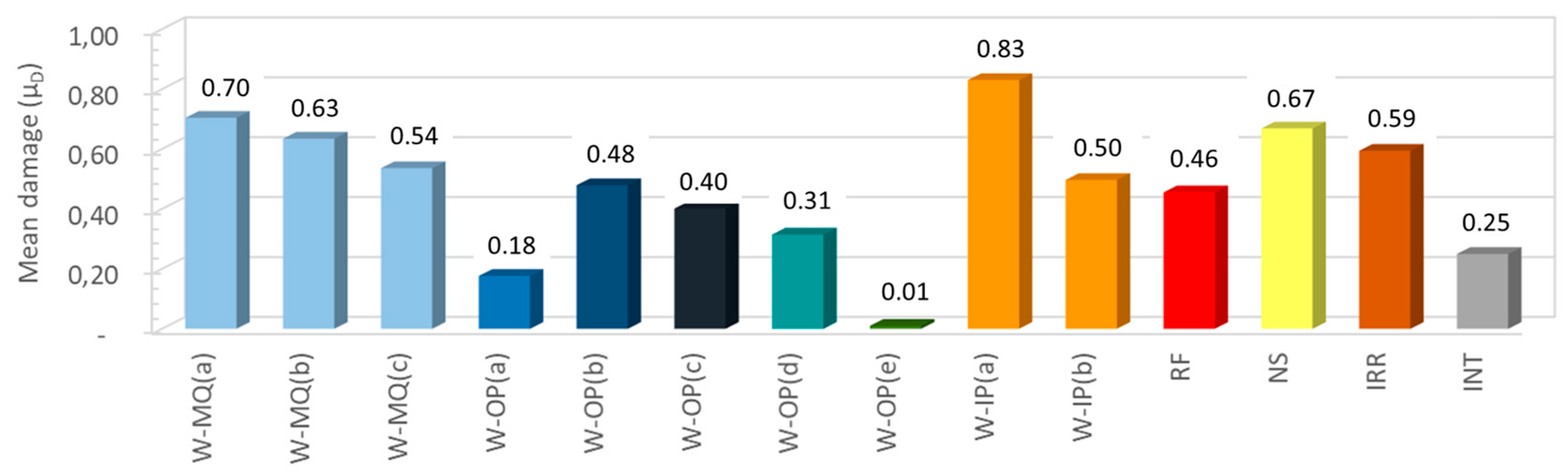 - Mode 2 mechanisms definitely prevailed, resulting in slight overall damage for the whole center. However, the estimate through the synthetic parameter of the mean damage per more detailed mechanisms revealed that IP shear damage occurred in the masonry piers more than in spandrels (i.e., it was observed in 116 buildings against 75, Figure 8). This means that 72% of the buildings were able to activate the favorable box-like behavior but not enough to also apply the optimal hierarchy of the capacity design concept. This would result in more accurate distribution of interventions to carry out on the bearing walls.