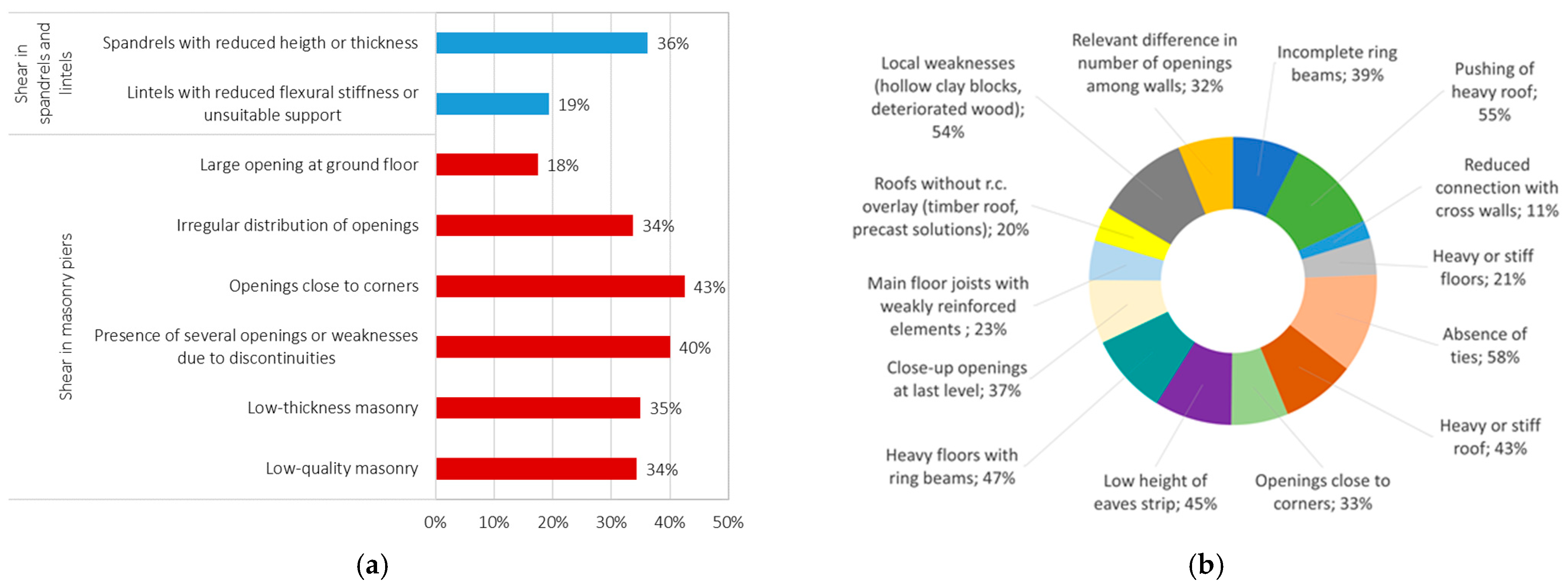 - Mechanisms affected by the masonry quality (MQ), i.e., (a) layer separation and masonry crumbling; (b) local effects due to discontinuities, voids, or poor connections; (c) sliding and/or pounding of rigid floors/roofs on walls;
