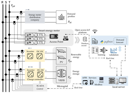 This schematic in Figure 1 represents a smart microgrid that integrates real-time energy metering, demand forecasting, renewable energy integration (PV), vanadium redox flow battery (VRFB) storage, an open IoT platform, and local and remote control of the microgrid. The sequential steps of the proposed methodology are summarized below.