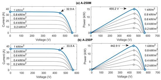 PV power and I-V characteristics: (a) Model A-250M and (b) Model A-250P.