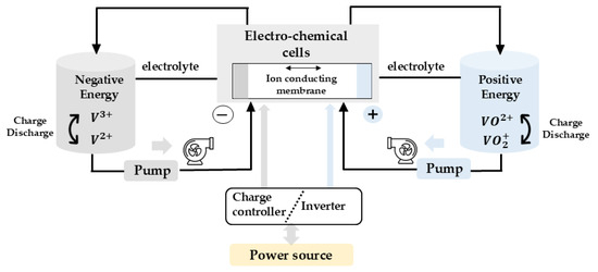 VRFBs operate by circulating liquid electrolytes containing different oxidation states of vanadium and on the negative side and and on the positive side, which react in electrochemical cells separated by an ion-conducting membrane (See Figure 5). During charging, an external source supplies energy that induces the oxidation of to and the reduction of to , storing chemical energy; while during discharge, the process is reversed, generating useful electrical current. The system includes pumps that drive electrolytes from external tanks to the cells, and an inverter that regulates the flow of power between the battery and the grid or load. This procedure efficiently manages multiple charge and discharge cycles with a response time in milliseconds, offering a constant power output without degradation. In addition to allowing a 100% depth of discharge (DoD) without affecting its lifespan, which allows for optimizing the overall efficiency of its storage capacity [32]. The state of charge is determined by the relative concentration of active ions in each tank, according to Equation (7):