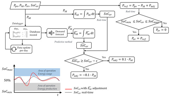 Figure 6 summarizes the automatic control algorithm according to the explanation of the previous equations, where its objective is to maintain the SoC of a storage system (VRFB) within safe limits by integrating real-time data and energy forecasts. This approach combines forecasting with real-time corrections to ensure operational stability in distributed energy systems.