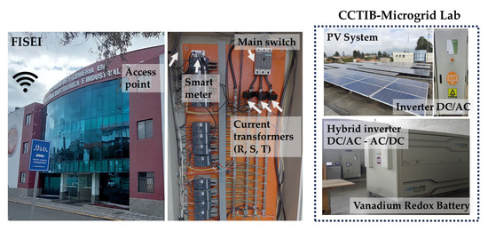 The data to carry out this study were used from the University of Cuenca’s Microgrid Laboratory and the experimentation of predictive data with smart meters from the Faculty of Systems, Electronics and Industrial Engineering of the Technical University of Ambato (See Figure 7) [31]. The photovoltaic systems consist of units of 15 kW. The VRFB storage system consists of 2 clusters on a 48 Vdc bus bar. This system is connected to the electrical grid via a bidirectional DC/AC converter with a storage capacity of up to 100 kWh and a reference power of up to 20 kW. The parameters of the microgrid components and equipment are detailed in Table 2 below.