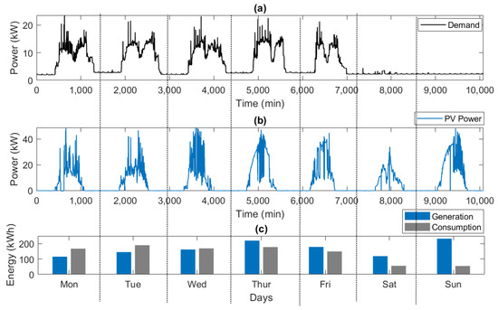 Case study evaluation: (a) Demand profile (b) PV generation, (c) Total energy.