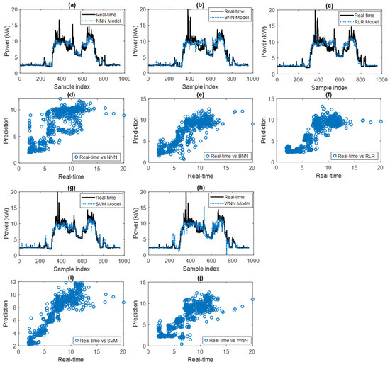 Demand prediction models were evaluated based on neural networks with supervised learning approaches such as Narrow Neural Network (NNN), Bilayered Neural Network (BNN), Robust Linear Regression (RLR), Support Vector Machine (SVM), and Wide Neural Network (WNN). Figure 9a–j show the evaluation results for training on four previous days and prediction on the fifth day. The results in the figure show a positive evaluation on the analyzed dataset: 70% for training and 30% for validation. This allows a visual observation of the degree of fit, peak tracking ability, and response to abrupt transitions. For this analysis, the same input data were considered for the different models in order to evaluate them under the same criteria. This temporal approach is especially relevant in energy systems, where daily patterns can present similarities but also stochastic variations. In addition, the relationship between real-time measurement and prediction is presented through the scatter chart of each of the models to reference their correspondence values. Consequently, the proximity of the points to the diagonal line indicates a high correspondence between prediction and actual values.