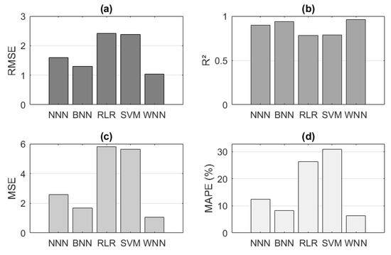 In this section, the results of the previous section are evaluated based on the Root Mean Squared Error (RMSE), R-squared (), Mean Squared Error (MSE), and Mean Absolute Percentage Error (MAPE) indices of the learning models and neural networks NNN, BNN, RLR, SVM, and WNN. These indicators allow quantifying the accuracy, fit, and efficiency of supervised learning models applied to energy demand time series. Table 3 details the definitions of each of these indices and the evaluation criteria for predictive demand models. These results are detailed in Figure 10a–d, where it can be observed that the WNN model is the one that best fits the expected results with values of RMSE = 1.0310, = 0.96, MSE = 1.0630, and MAPE (%) = 6.3. This model uses a wide network architecture (more neurons per layer) rather than a deep one, making it ideal for systems requiring real-time responses. Furthermore, the ReLU activation function improves training speed and generalization capabilities, facilitating the learning of nonlinear patterns in demand time series. This stands out notably compared to the other models. Similarly, the second model that represents good results in the validation phase is BNN with values of RMSE = 1.2979, = 0.94, MSE = 1.6844, and MAPE (%) = 8.3. Both systems use a feedforward architecture and a ReLU activation function, which demonstrates their solid base in the application of predictive demand models. On the other hand, the RLR and SVM models represent higher RMSE values of 2.4085 and 2.3742, respectively, which rule out their direct application as optimal methods in demand prediction for this study. The RLR model has demonstrated lower accuracy in time series with high demand variability and making it difficult to capture nonlinear relationships. This is also true of the SVM model, which requires specific parameter tuning. However, these models directly learn the relationship between input and output variables without modeling the joint distribution of the demand data. In addition, these models also have MAPE (%) values of 26.3 and 30.9, which demonstrates their low adaptability in environments with daily demand variability. Although these models use Supervised Regression with adaptive linearity, they have not demonstrated their effectiveness as adequate predictive models.