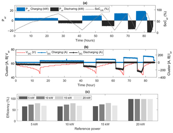 Additionally, Figure 11 presents the evaluation of the previously performed tests. The power values assigned as 5 kW, 10 kW, 15 kW, and 20 kW for charging and discharging the VRFBs are observed. The SoC remains within safe operating ranges (5–95%), indicating adequate storage management without overcharging or deep discharging. Furthermore, the SoC shows a consistent response with the power profiles, validating the synchronization between demand and storage capacity. Furthermore, the current values for each cluster can range above 200 A. This current distribution among the clusters suggests balanced module management, without localized overload. Similarly, the voltage values are shown as a function of the state of charge on the 48 Vdc of each cluster (See Figure 11b). The SoC estimation is performed using a voltage-based model, which relates the DC terminal voltage to the battery charge level. Each cluster in the system presents an experimentally obtained voltage-SoC characteristic curve, which allows the SoC to be inferred from the voltage measurement. The defined operating range is from 44 V to 62 V, corresponding to a SoC between 5% and 95%, which guarantees a safe operation preset for experimental evaluation. Each cluster exhibits slight variations in its voltage-to-SoC curve due to differences in internal resistance, effective capacitance, and thermal conditions. Therefore, the model includes specific adjustments for each unit, allowing for a more accurate and reliable estimate based on this practical estimation method. Due to its simplicity and low computational cost, this method is efficiently integrated into predictive control architectures, allowing dynamic adjustments in the energy management of microgrids with VRFB. Finally, in Figure 11c, the efficiency values are calculated based on the charge and discharge time at each assigned reference power step. Proving to be optimal for high-power charging processes and slow discharges at different values. Furthermore, in most cases, its efficiency is above 80%. These values confirm that the system is viable for medium-power applications, with competitive performance in real-world scenarios.
