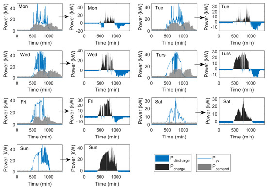 Based on these considerations, Figure 12 presents the energy management scenarios for the different days of the week, based on the demand forecast and the availability of PV generation. In this context, the model’s predictive capacity enables active participation in adjustment markets, as well as the sale of surpluses and dynamic demand response, generating additional economic value through the strategic use of the storage system when energy surpluses are detected. Energy distribution using VRFB is optimized based on the demand forecast, allowing for efficient weekly allocation under variable renewable generation conditions. Consequently, load response and distributed generation are effectively coordinated, ensuring stable and efficient system operation.