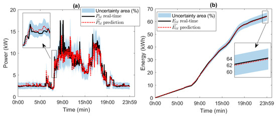 The evaluation of the power prediction and energy prediction results is presented in Figure 13a and Figure 13b, respectively. They detail the response of the WNN model after training with historical data and subsequent real-time validation. For analysis purposes, a 15% uncertainty margin was defined for instantaneous power, as well as a cumulative band for total energy. The results demonstrate high accuracy in estimating daily energy demand (64 kWh), with a consistent fit between predicted and observed values. The WNN model demonstrates optimal coupling capacity, ensuring robust and reliable real-time prediction, supporting energy planning and efficient operation of the storage system.