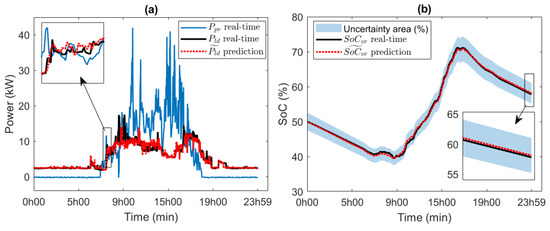 Validation of predictive models: (a) prediction of power demand in real-time environments and PV generation, and (b) prediction of the state of charge.