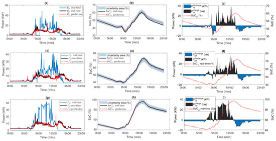 Sensitivity analysis of system power and load: (a) Low PV generation, (b) SoC under low-generation conditions, (c) Reference power under low-generation conditions, (d) Medium PV generation, (e) SoC under medium generation conditions, (f) Reference power under medium generation conditions, (g) High PV generation, (h) SoC under high generation conditions and (i) Reference power under high generation conditions.