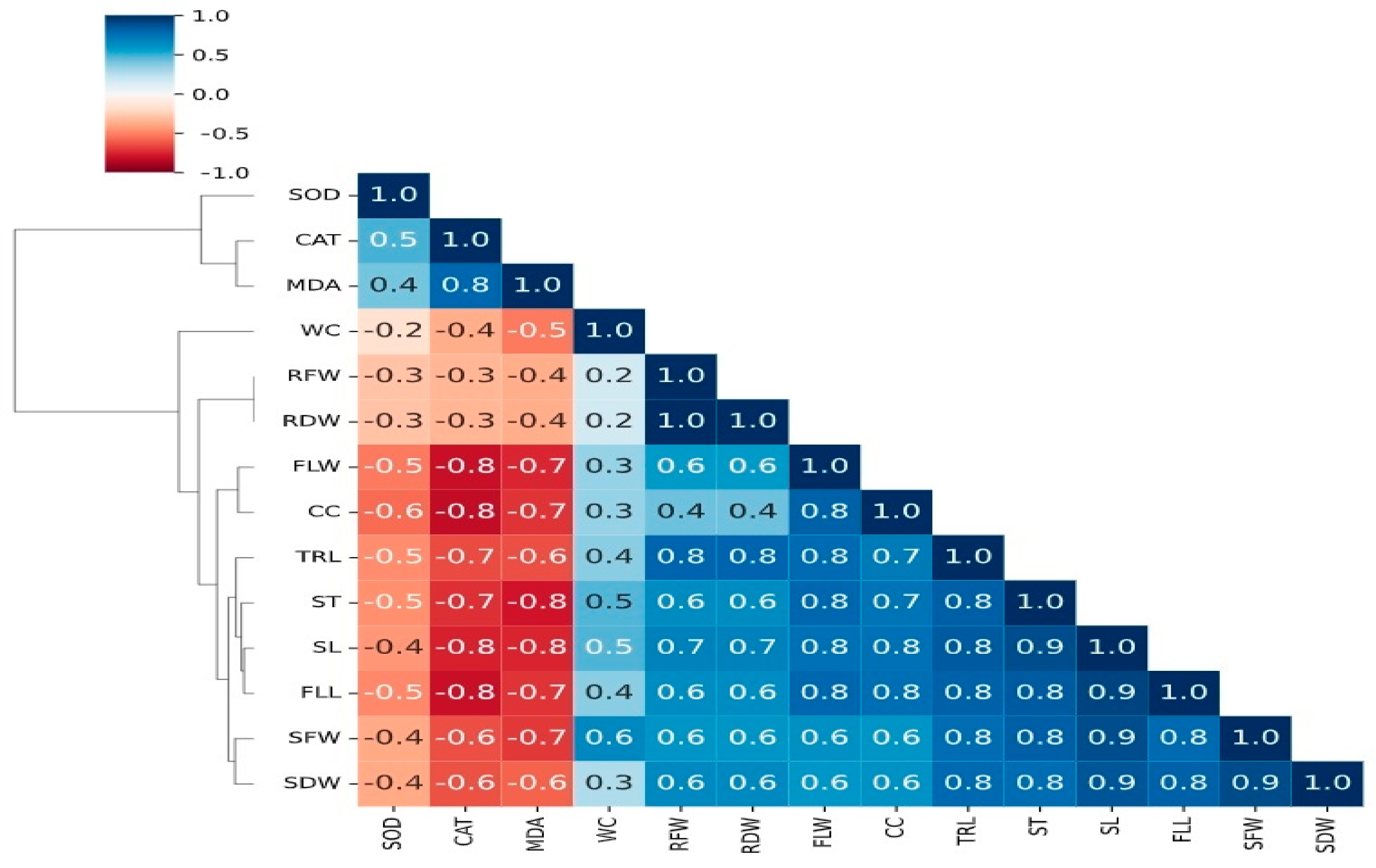 Treatments | Chlorophyll Content (Spad) | Flag Leaf Length (cm) | Flag Leaf Width (cm) | Stem Thickness (mm) | Water Content |