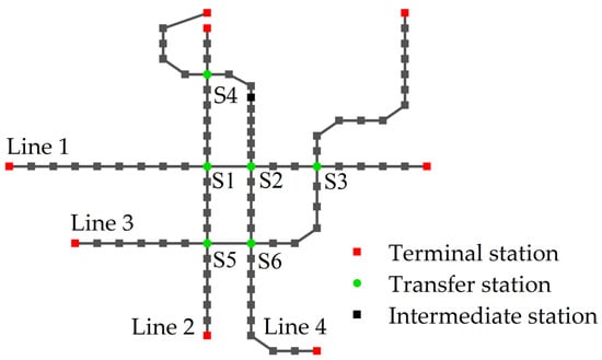 This study focuses on a representative metro station selected from the network of Xi’an in China. The simplified network topology is illustrated in Figure 1. The network comprises 4 lines, 89 nodes, and 91 links. Green circular nodes indicate six transfer stations, while red square nodes denote eight terminal stations. The target station, S1, serves as a transfer point between Lines 1 and 2. It is equipped with 6 entrances/exits, 16 entry turnstiles, and 34 exit turnstiles. The station is located in an area with a high density of schools and hospitals and primarily serves commuting and holiday-related passenger flows.