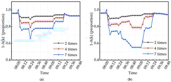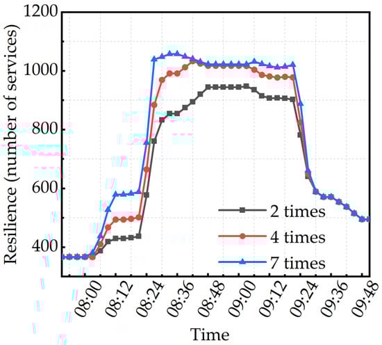 Figure 4 illustrates the temporal distribution of resilience at Station S1 under varying levels of passenger inflow. It can be observed that before the disturbance (i.e., before 08:00), the station’s resilience is not zero. This is attributed to the presence of transfer passengers and those who, despite entering the station, fail to board the train in time, such as passengers who arrive shortly before a train departs and are unable to reach the platform promptly. This demonstrates that resilience remains active throughout station operations and manifests differently under distinct passenger flow control scenarios. Following the disturbance, a comparison of different inflow levels reveals that the resilience value under the four-times inflow scenario is similar to that under the seven-times scenario, yet significantly higher than that under the two-times scenario. This indicates that the four-times inflow level achieves a better balance between maintaining service capacity and minimizing passenger delays, making it a more effective passenger flow control measure, which is consistent with the conclusion proposed by Yuan et al. []: ‘optimal passenger flow control should balance passenger travel and minimize the number of delayed passengers within the station’.