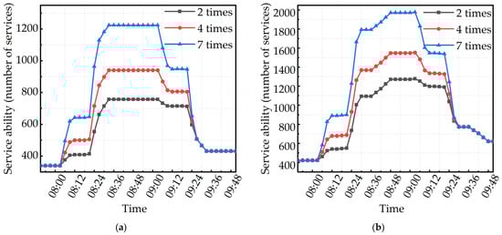 Temporal variation in the service capacity of S1-line1 and S1-line2 under different passenger inflow levels. (a) The service capacity of S1-line1; (b) The service capacity of S1-line2.