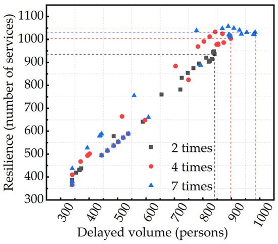 Figure 5 depicts the relationship between the average number of delayed passengers within the station for S1-line1 and S1-line2 and the resilience of Station S1. The resilience distribution boundary is defined as the upper and lower bounds of a station’s resilience under varying passenger flow control strategies. The dashed lines indicate the resilience distribution boundaries corresponding to the maximum number of delayed passengers under inflow levels of two times, four times, and seven times. A comparison of these boundary regions reveals that as the growth rate of passenger delays increases, the growth rate of resilience gradually declines. This phenomenon aligns with the negative correlation between resilience and passenger delays proposed by Liu et al. [] and Xu et al. []. This phenomenon arises because, although the station’s service capacity increases with rising passenger inflow, its ability to reduce delays diminishes. The interaction between these two opposing trends results in a deceleration of resilience growth, demonstrating that the proposed station resilience measurement model is sensitive to varying disturbance scenarios.
