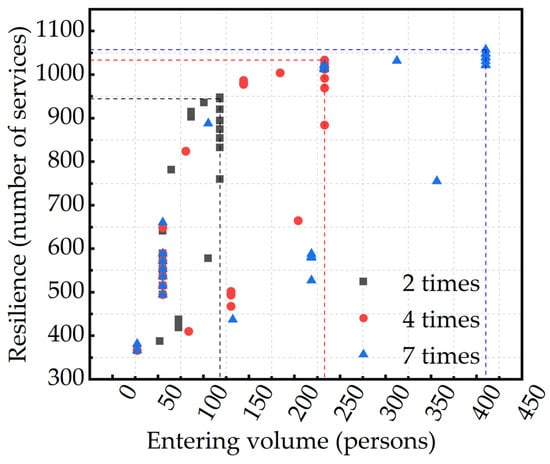 Figure 6 illustrates the relationship between the average passenger inflow at S1-line1 and S1-line2 and the resilience of Station S1. The dashed lines represent resilience distribution boundaries, defined by the maximum passenger inflow under the two-times, four-times, and seven-times scenarios. It can be observed that within each region, resilience increases with passenger inflow. This indicates that, despite varying flow control measures, the station can maintain service capacity while effectively reducing delays. However, a comparison of the regional boundaries reveals that the rate of increase in resilience gradually diminishes as the inflow continues to rise. A possible explanation is that the station’s service capacity approaches its upper limit due to constraints on train capacity, while its ability to reduce passenger delays continues to decline. This interaction results in a slower growth of overall resilience.