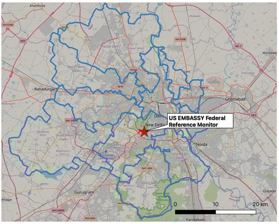 US Embassy Reference Grade Sensor location (RK Puram) and New Delhi Boundary [29,30].
