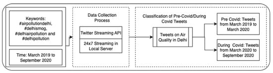 Considering severe air pollution in Delhi, hashtags such as #airpollutiondelhi, #delhismog, #delhiairpollution, and #delhipollution gained significant traction on Twitter as air quality levels worsened dramatically. The increase in pollution adversely impacts residents of both urban and suburban regions, resulting in a substantial surge of tweets that rapidly turn these hashtags into trending topics. The initial phase of our analytical framework involved collecting tweets related to air pollution from Twitter. For this purpose, we used Twitter’s Streaming API with the Researcher Access API (https://docs.tweepy.org/en/stable/api.html, accessed on 20 August 2025). It was continuously streamed through a local server running 24 × 7 from 20 March 2019 to 20 September 2020, retrieving more than million tweets. Network and power interruptions resulted in snags in data collection, with some days of data missing within this period. Every tweet gathered via the API contains several essential attributes, including a unique 64-bit integer tweet-id, the creation timestamp (created_at), the user_id of the tweet author, tweet text, and many more. Given the scope of our research for monitoring Delhi’s air pollution, we filtered the data set to include only English-language tweets explicitly related to Delhi’s air pollution for reliable preprocessing and NLP tool support. We collected using the X/Twitter streaming API filtering features that allow exclusion based on language, location, and specific keywords. Additional filtering was performed using combinations of targeted hashtags such as #NewDelhiairpollution, #delhipollution, #delhismog, #delhichokes and #savedelhi. After applying such parameters, we analysed the dataset of 1.1 million tweets, focusing on tweet content and user profiles. Related to the filtration of tweet content while analysing user intents, we only considered the removal of undesired elements, i.e., stop words, hashtags, links, emojis, URLs, @, other exclamations, and non-ASCII characters, since they are not required in the intent analysis. We also collected air quality data from the US Embassy’s monitoring station in Delhi (https://in.usembassy.gov/air-quality-data-information-4/ accessed on 20 August 2025). The US Embassy’s data provided detailed monitoring on principal pollutants, including , with rigorous data validation recorded at 60-min intervals. These ground truth data were analysed alongside the tweets for the time frame from March 2019 to September 2020, enabling a comprehensive assessment of pollution patterns, particularly concerning levels in Delhi. The details about the data collection process have been depicted through Figure 2.
