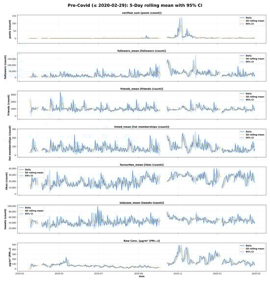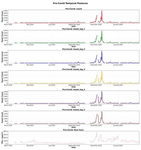 Now, the temporal & user-specific features of the tweet corpus are analysed, which have been posted in the pre-COVID-19 timeline, to evaluate their impact on raw concentration. In Figure 3, the timeline plot of behavioural patterns of tweet count & count lags (1–5) has been depicted along with the change in raw concentration daily.